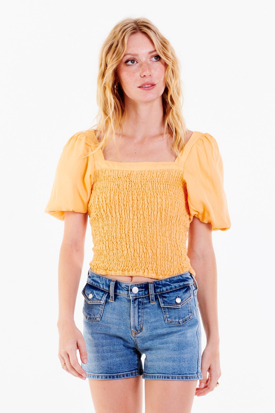 Puff sleeve top with shirred shoulder & elastic cuff on square neckline finished in smocked bodice.