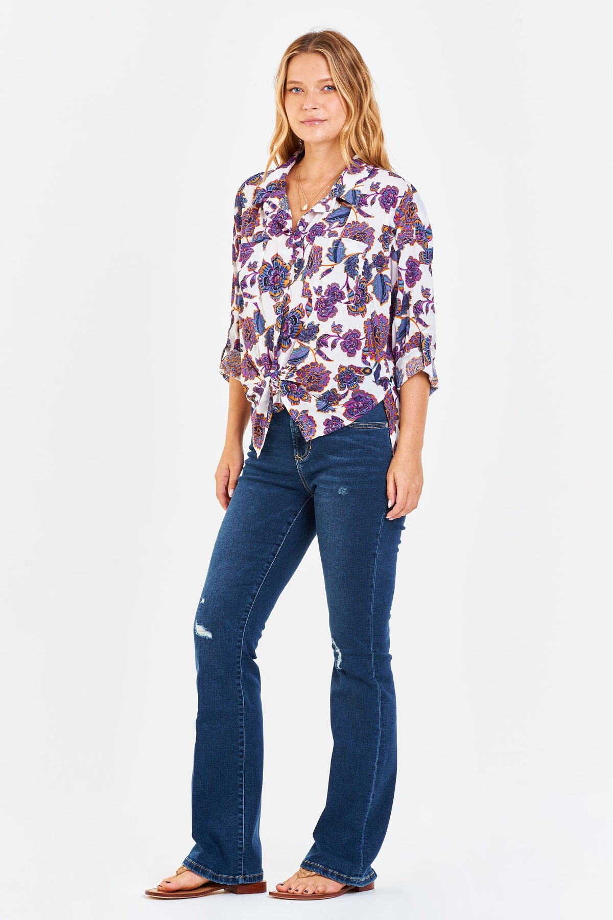 Front tie shirt with drop shoulder, long sleeve button front finished with cuff band, high side slit, back yoke.