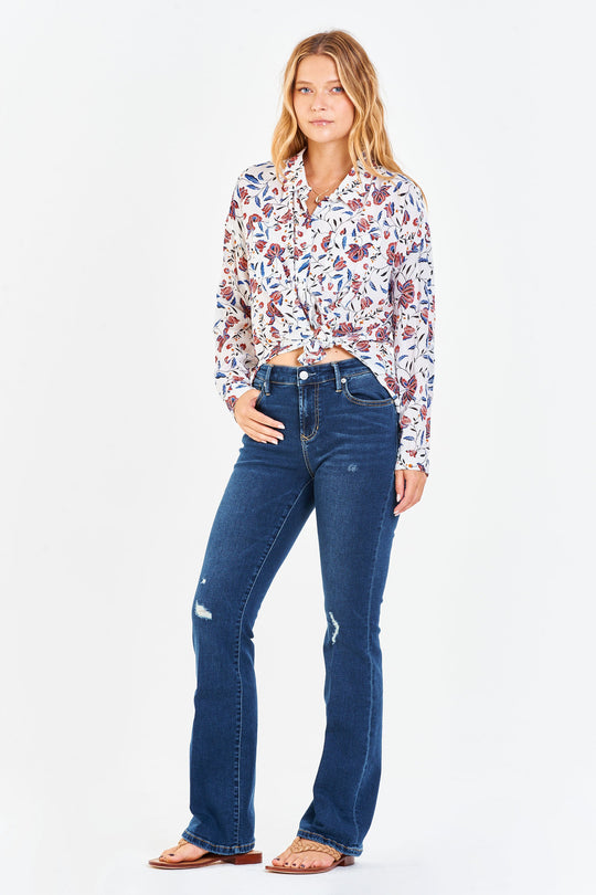 Front tie shirt with drop shoulder, long sleeve button front finished with cuff band, high side slit, back yoke in devine print on modal softness!