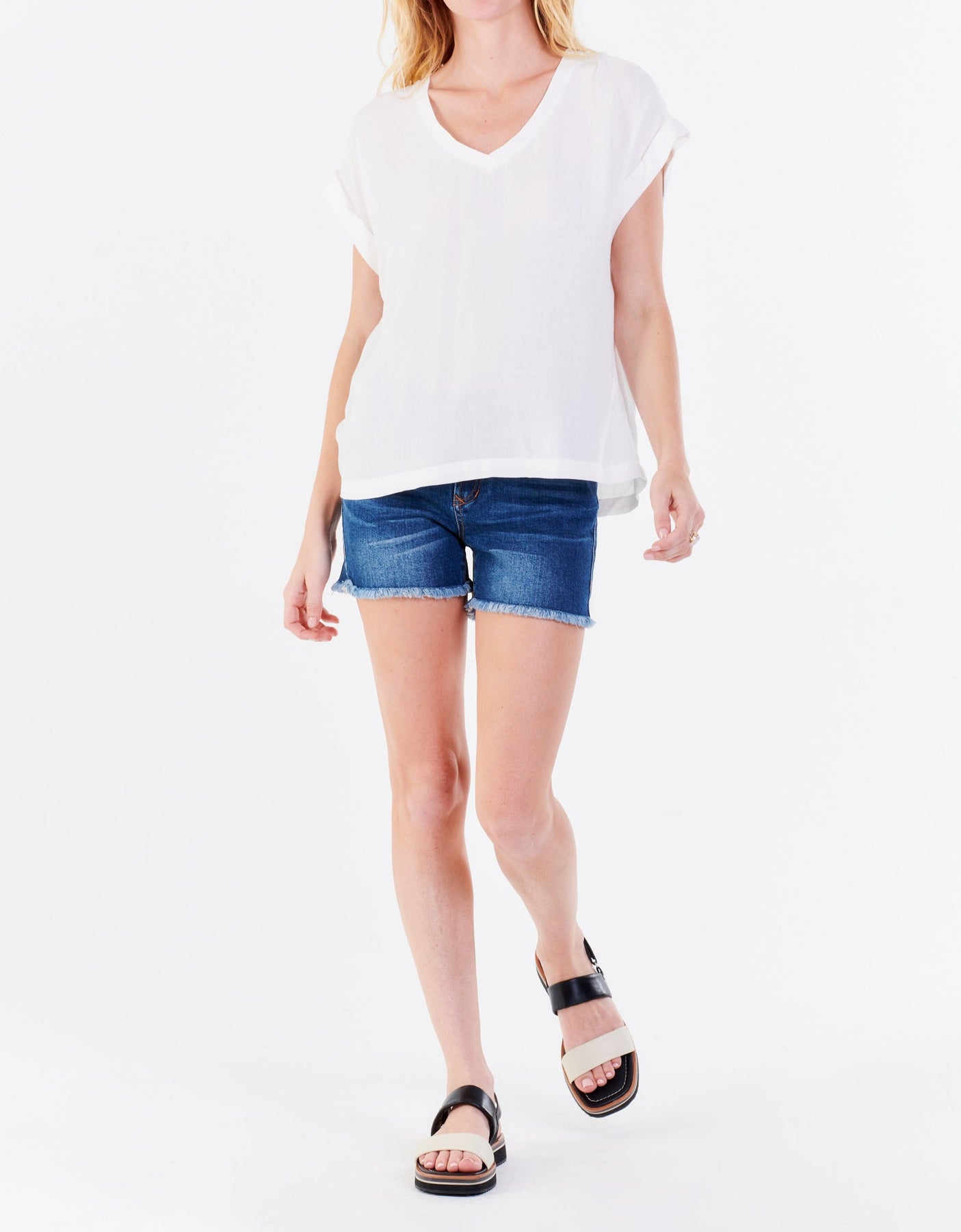 Drop shoulder top with gauze softness, v-neck finished with tacked cuff band.