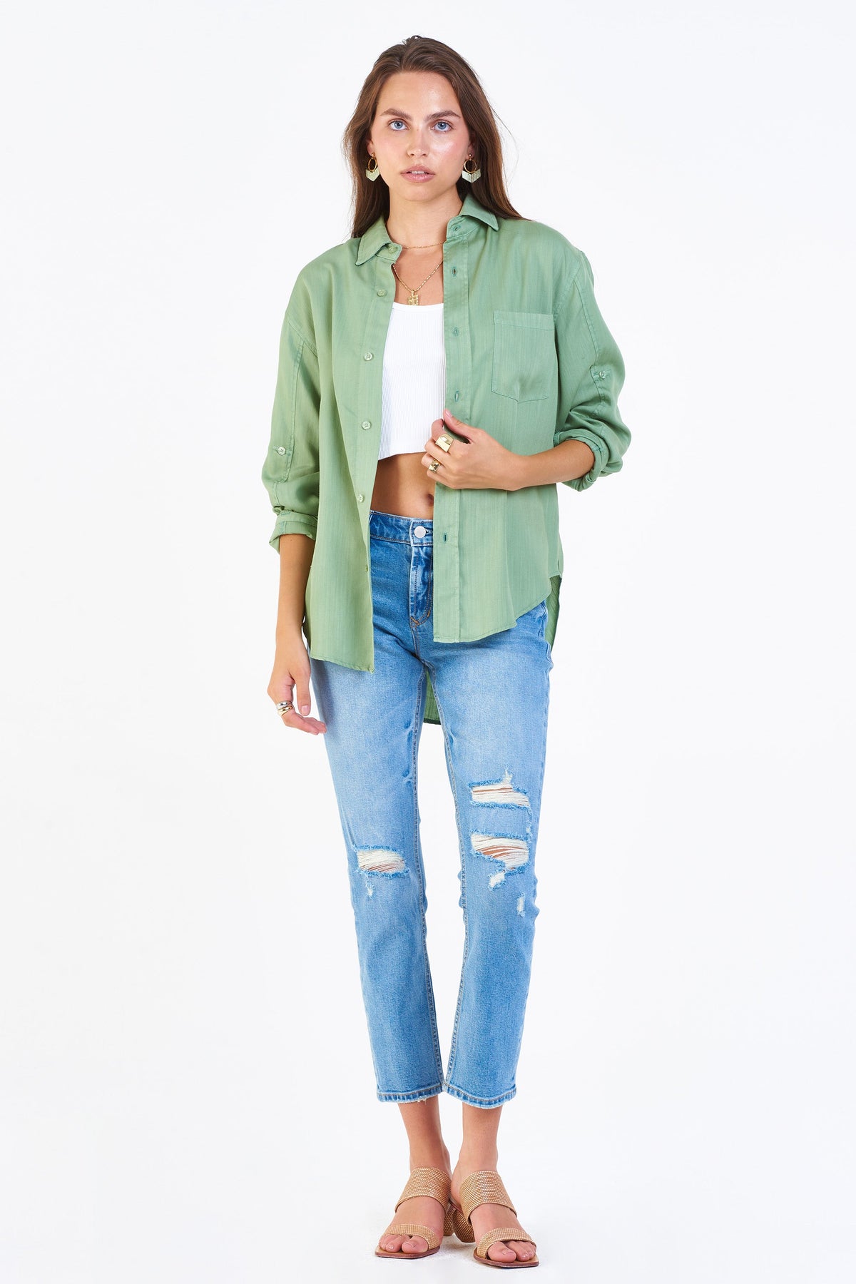 Oversized shirt with drop shoulder, button front long sleeve finished with rolled cuff tab & cuff band, back yoke, curved hem.