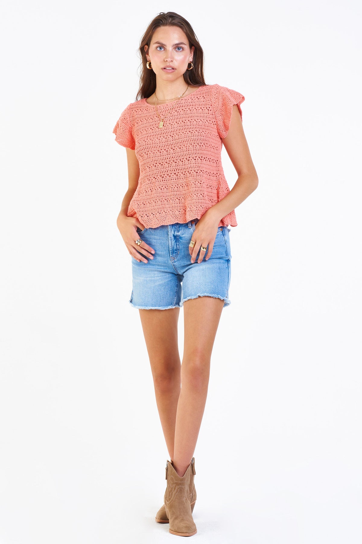 Allover crochet details & pointelle eyelets sweater, wide neck finished with petal sleeve & scallop edges.