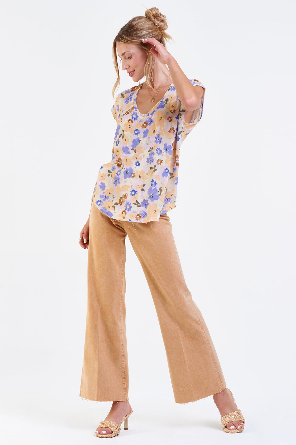 Artisan printed top, frayed neck & hem, v-neck finished sleeveless in watercolor floral print.